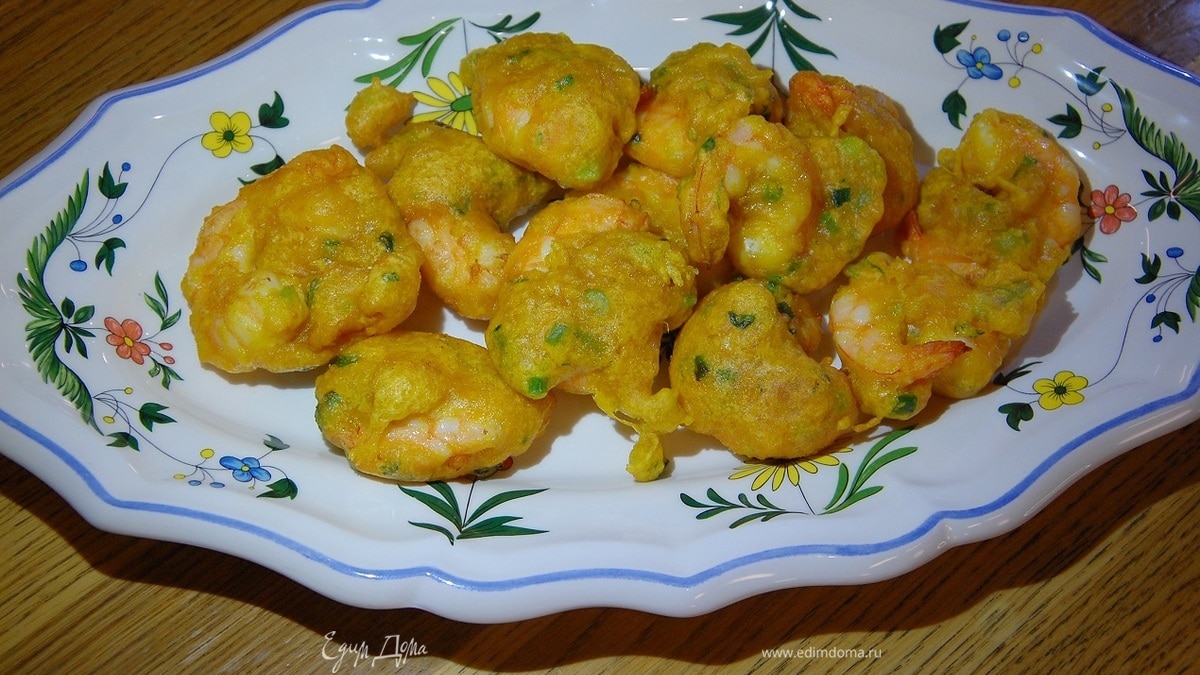 Креветки в кляре с перцем чили, зеленым луком и куркумой