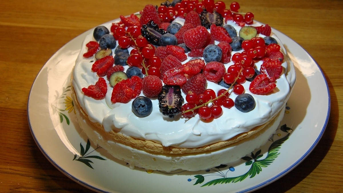 Охлажденный корж с мороженым вынуть из формы, на него поместить второй корж, равномерно покрыть взбитыми сливками и украсить ягодами.