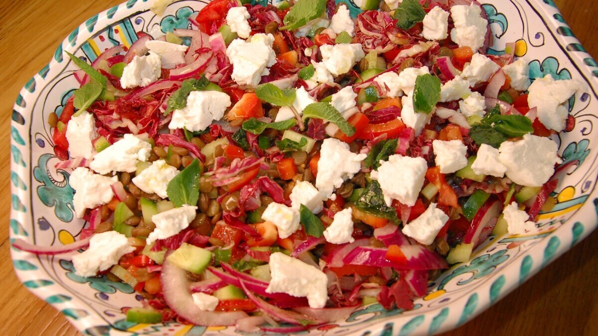 Салат из чечевицы с овощами, козьим сыром и мятой