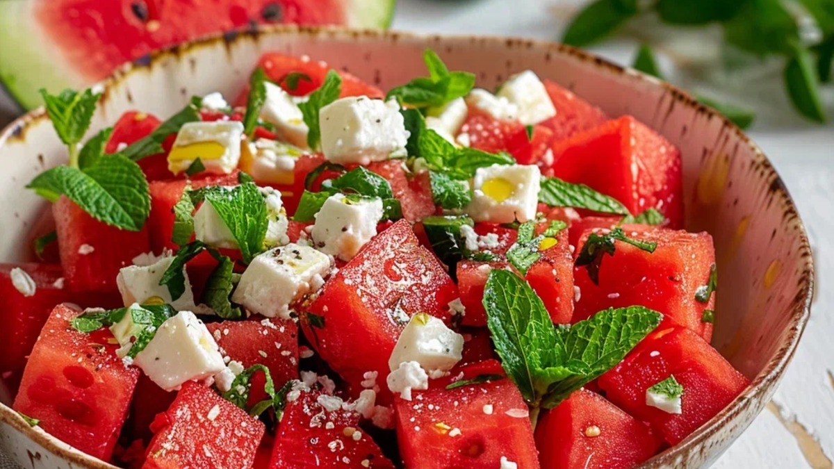Освежающий салат с контрастным сочетанием сладкого арбуза, солёной феты и прохладной мяты. Простой, эффектный и идеально подходящий для жаркой погоды. Подаётся охлаждённым, часто как закуска или лёгкий гарнир.