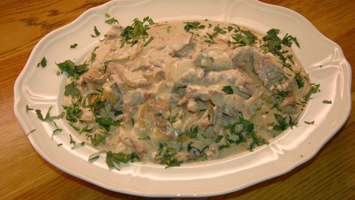 Свой собственный рецепт бефстроганова есть у многих поваров, поэтому я не претендую на аутентичность — есть и Молоховец, и другие источники. Но лично мне очень нравится тонко нарезанная говядина в соусе, где много грибов, много сметаны, много жареного лука, получается такой субботний бефстроганов.