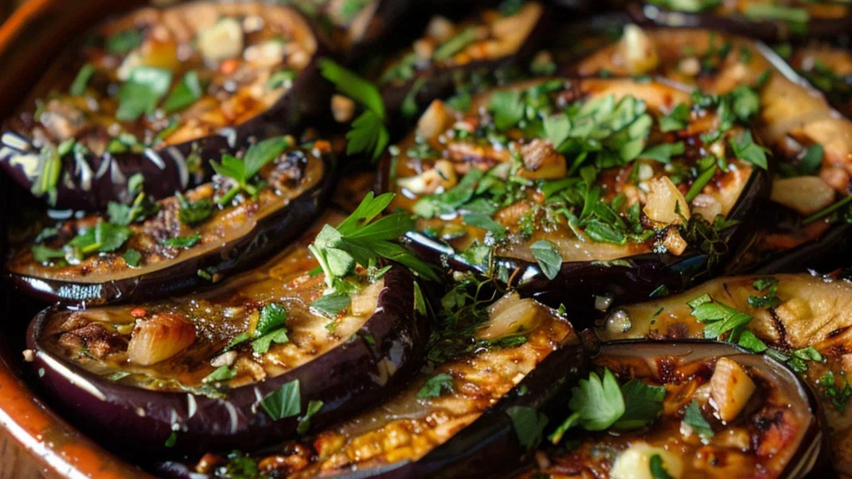 Простой, ароматный и полезный гарнир или закуска. Баклажаны запекаются до мягкости, а затем пропитываются свежей заправкой из чеснока, масла и зелени. Отлично сочетаются с мясом, рыбой или подаются как холодная закуска.