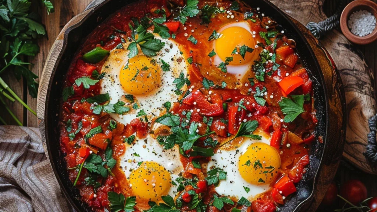 Яркое и ароматное блюдо родом с Ближнего Востока. Обжаренные овощи тушатся в томатном соусе, а сверху аккуратно запекаются яйца. Идеально для сытного завтрака или лёгкого ужина.