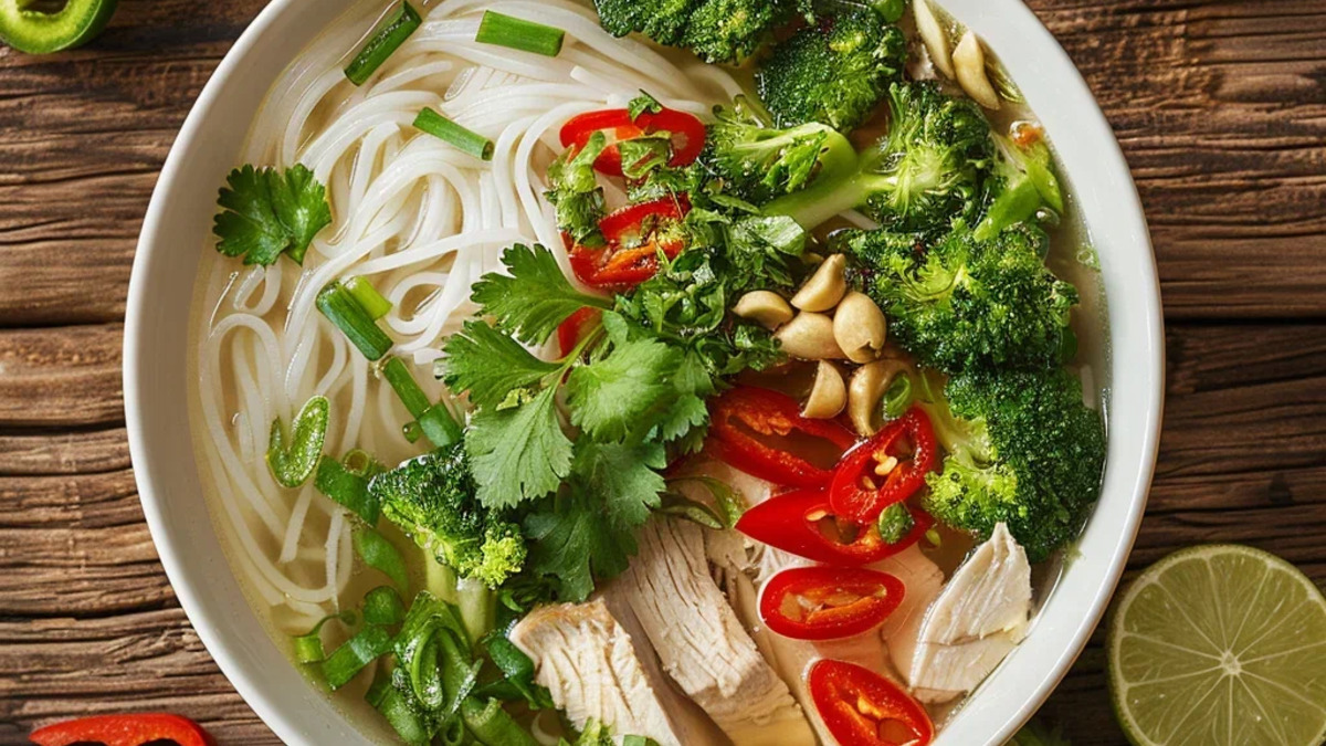 Лёгкий, ароматный вьетнамский суп с курицей и свежими овощами. Пряный бульон на основе специй, лапша и зелень делают блюдо насыщенным, но при этом полезным. Отлично подходит для обеда или ужина, особенно в прохладные дни.