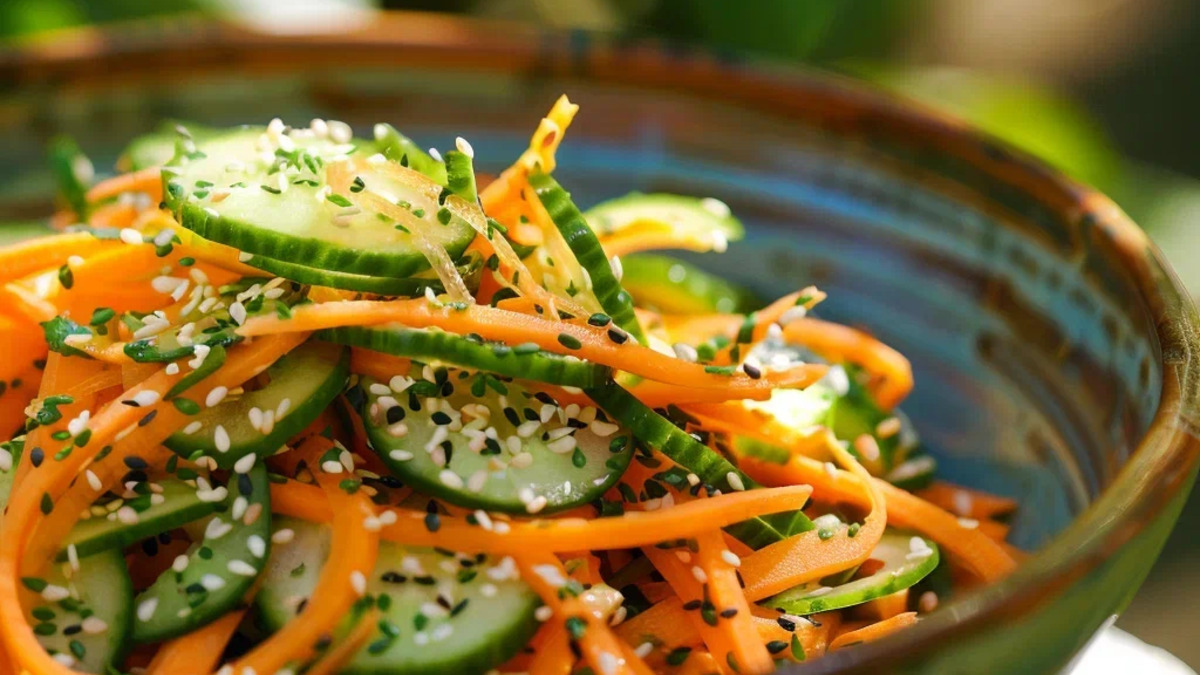Салат с морковью, огурцом, кунжутом и соусом с лаймом