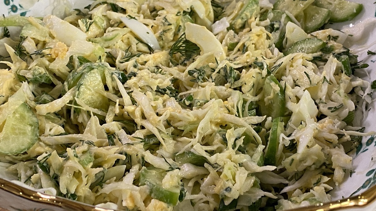 Салат из молодой капусты и огурцов с заправкой на желтках