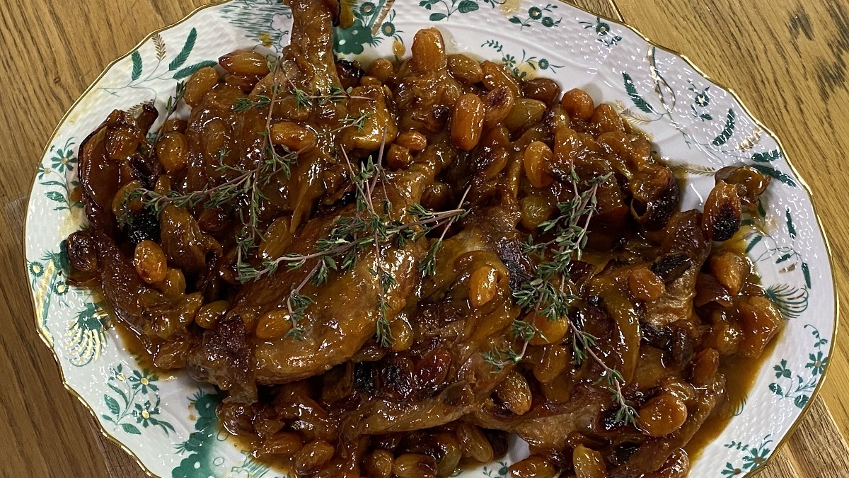 Утиные ножки, томленные в сидре с красным луком, изюмом и медом