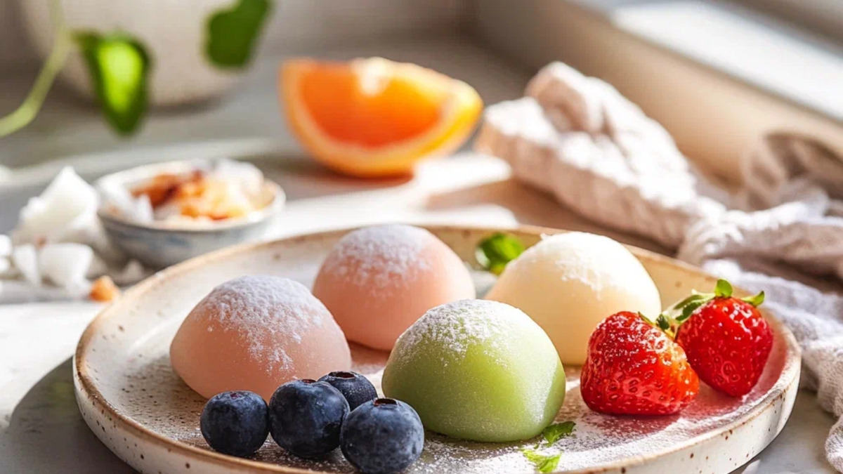 - Готовые мотти выложите на тарелку, слегка присыпьте сахарной пудрой.