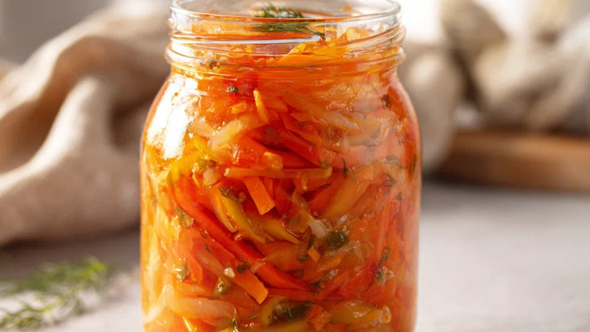 Яркий овощной салат с насыщенным вкусом и ароматом — отличная заготовка, которая зимой подарит летнее настроение. Хрустящая капуста, сочная морковь и сладкий перец в томатном соусе делают этот салат универсальным гарниром.