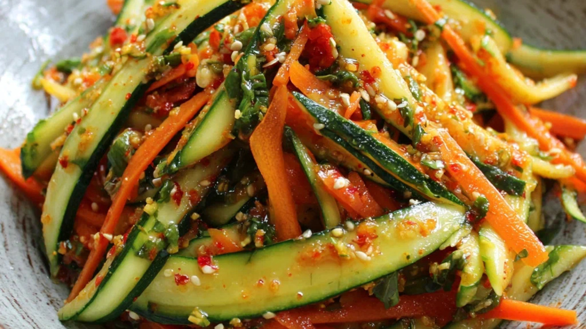 Пряный салат из кабачков и моркови по-корейски с чесноком и специями. Подаётся как закуска или гарнир к основным блюдам.