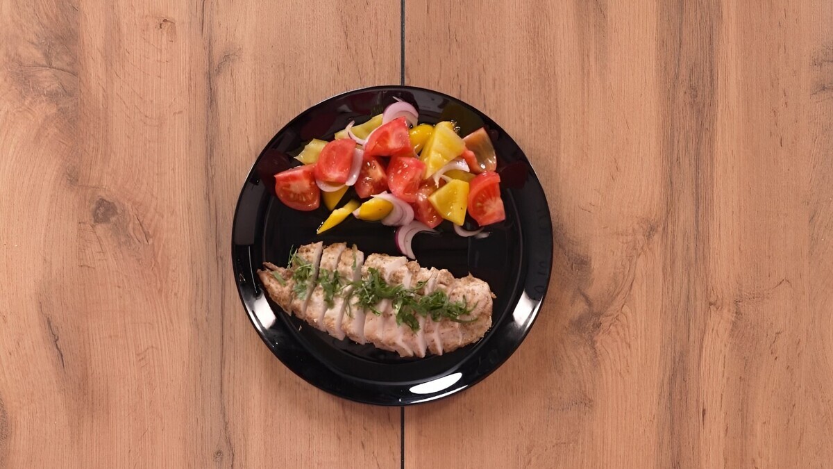 Порядок заправки: сначала соль и перец (прямо на овощи), потом оливковое масло. Если сделать наоборот — масло обволакивает овощи, и специи не попадают на них. - Шаг 9