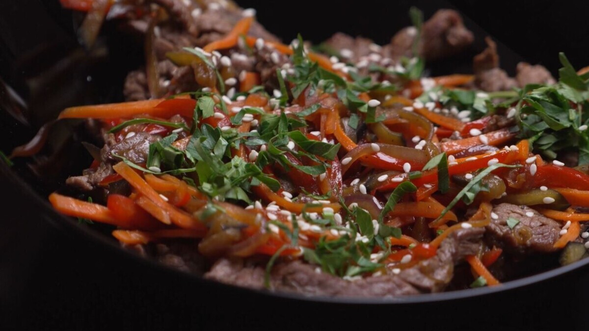 Привет, я шеф-повар онлайн-курса по заготовкам "Про запас" Артем Ларичев. Сегодня приготовим говядину стир-фрай. Слово переводится как "мешай и жарь". Сильный огонь, быстрая обжарка, тонкая нарезка — и через 10 минут ужин готов.