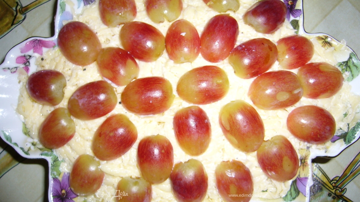 - Шаг 1Выложить сырную массу на ананас, разровнять. Сверху укладывать разрезанные пополам виноградины.