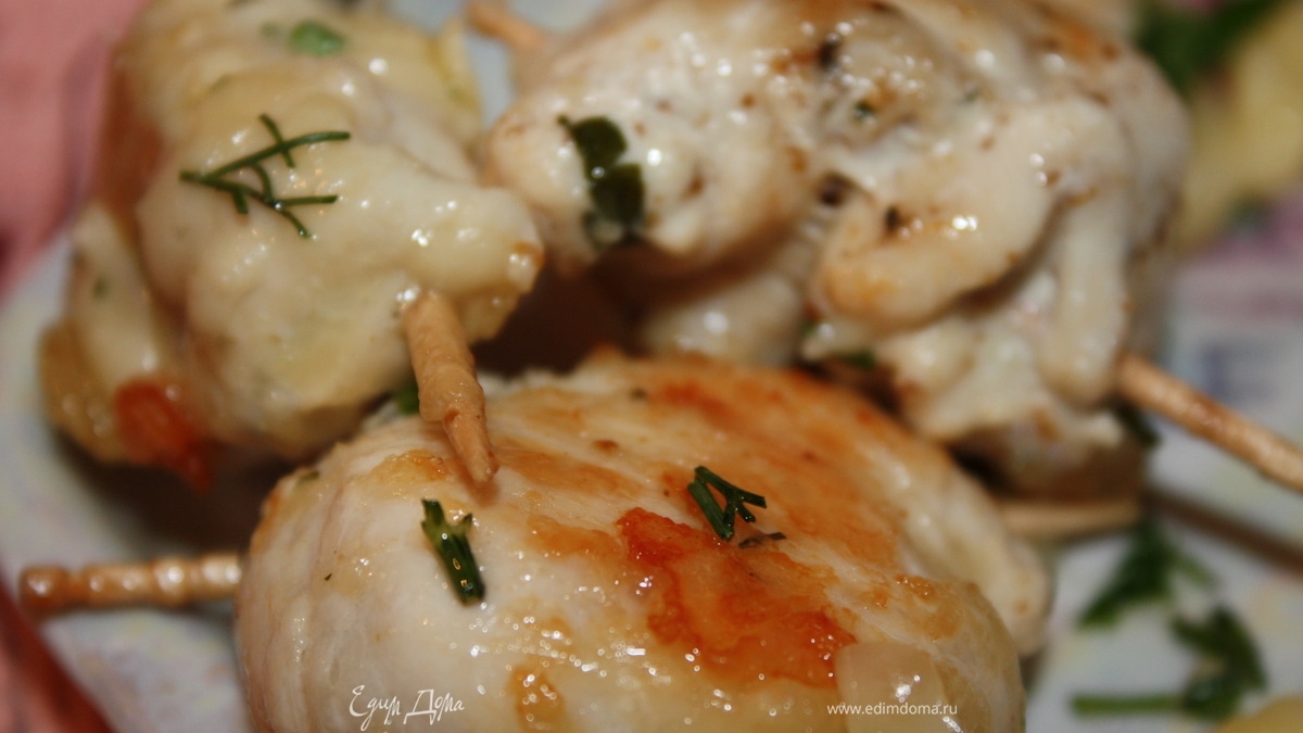 - Шаг 3на край нарезанного пласта куриного филе выложить щепотку зелени и сыр, завернуть его в рулетик, края рулетика соединить шпажкой.