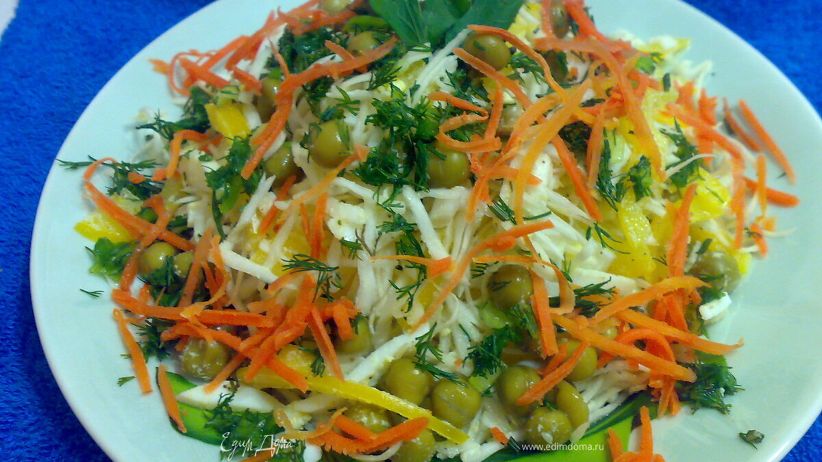 - Шаг 1Капусту нашинковать,помять с солью. Перец вымыть,удалить сердцевину и нарезать тонкими полосками. Яйца мелко нарезать,зелень измельчить. Все ингредиенты перемешать,добавить зеленый горошек,соль,перец по вкусу.