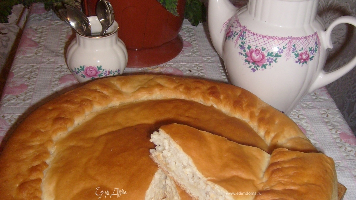 Готовое тесто поделить на две неравные части. Одну часть раскатать, выложить в форму, сверху-начинка, другую часть раскатать и уложить на начинку, краешки красиво защипнуть. Пирог выпекать в разогретой духовке 30 мин. готовый пирог смазать маслом, укрыть потеплее.