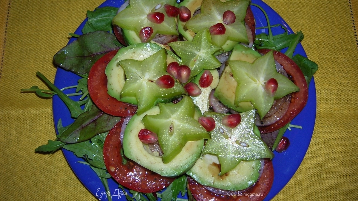 На тарелку выложить руколу - на нее помидоры, нарезанные кружочками, затем лук, немного посолить и поперчить (желательно свежемолотый перец). На лук положить авокадо (пластинками, кольцами, полукольцами - как удобнее). По желанию - посолить, поперчить. Сверху украсить звездочками карамболы и зернами граната. Сделать соус из оливкового масла и бальзамического уксуса и сбрызнуть салат сверху (или полить, если этот соус вам очень нравится). Приятного аппетита!