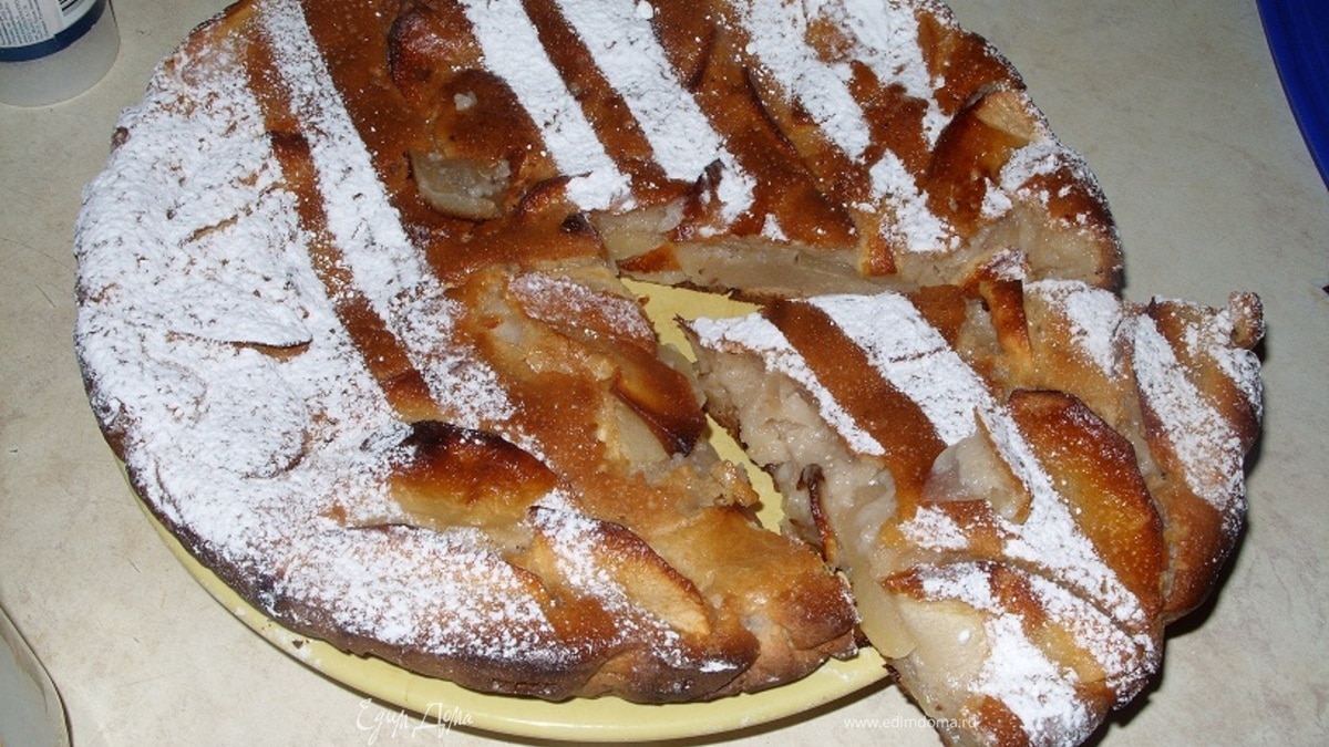 старя добрая шарлотка! Она в моем исполнени отличаается только тем, что на смазанную маслом форму я сначала укладываю яблоки в дв слоя, а затем заливаю тестом. Конечно, ПЯТЬ!