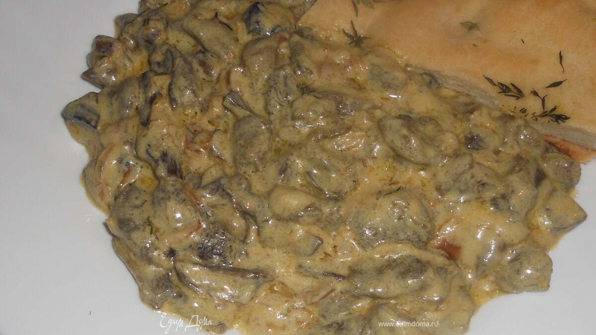 - Шаг 1Чеснок очистить, раздавить плоской стороной ножа, обжарить на оливковом масле, вынуть. Луковицу мелко нарезать, обжаривать на медленном огне до мягкости, минут 5-7. Предварительно размороженные грибы присоединить к луку, готовить минут 15 на достаточно сильном огне без крышки (вся лишняя жидкость должна выпариться), после чего огонь уменьшить, залить грибы сметаной, посыпать листиками тимьяна, посолить, перемешать, накрыть крышкой и тушить еще минут 10-15. За пару минут до готовности можно добавить несколько кусочков сливочного масла, но это необязательно! Очень душевно с теплой фоккачей! :)ссылка на рецепт