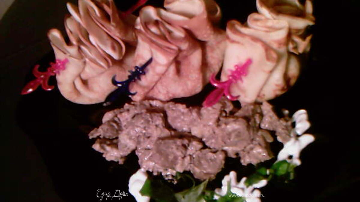 5На первый взгляд похоже на букет цветов, а только потом просматриваются блинчики и начинка, очень красиво.