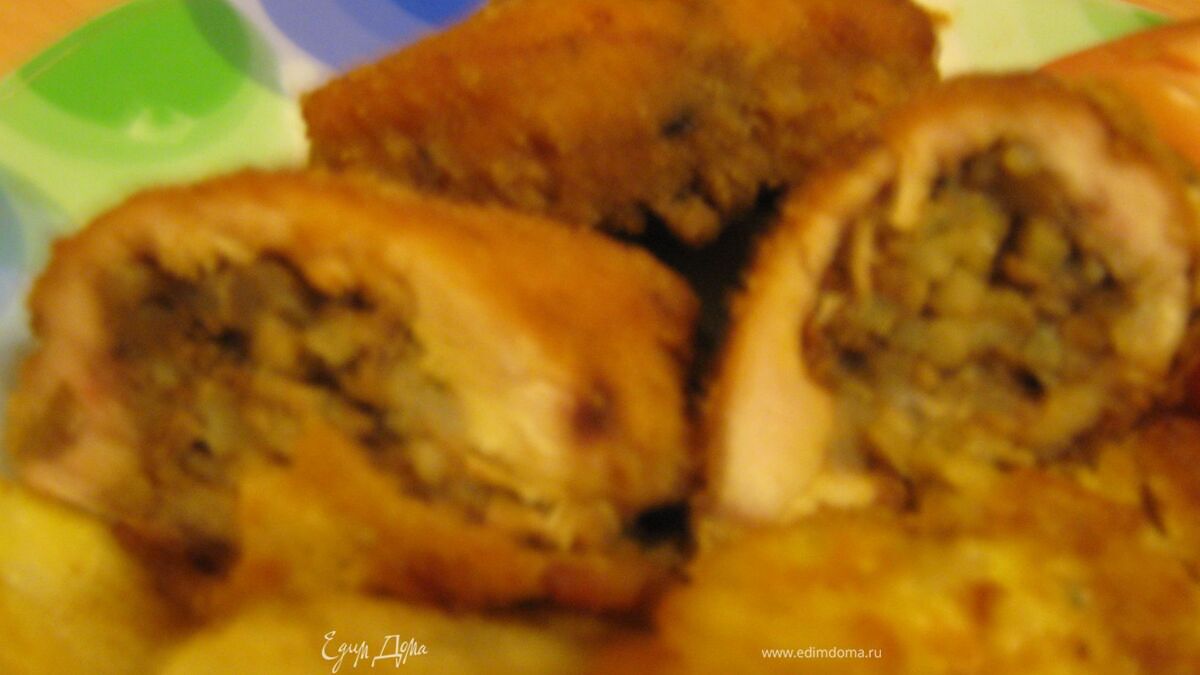 - Шаг 1Куриные грудки нарезать порционно и отбить(я делаю это в пакете, чтоб не разорвать мясо).Луку мелко нарезать,обжарить. Грибы отварить, измельчить в блендере(но не совсем в пюре), отправить их к луку, обжаривать и через минут 5 добавить специи ,соль и чайную ложку цедры лимона. Отварить рис, смешать его с грибами, и нафаршировать куриные отбивные, закрутить рулетики обмакнуть в яйце, панировочных сухарях и обжарить со всех сторон.