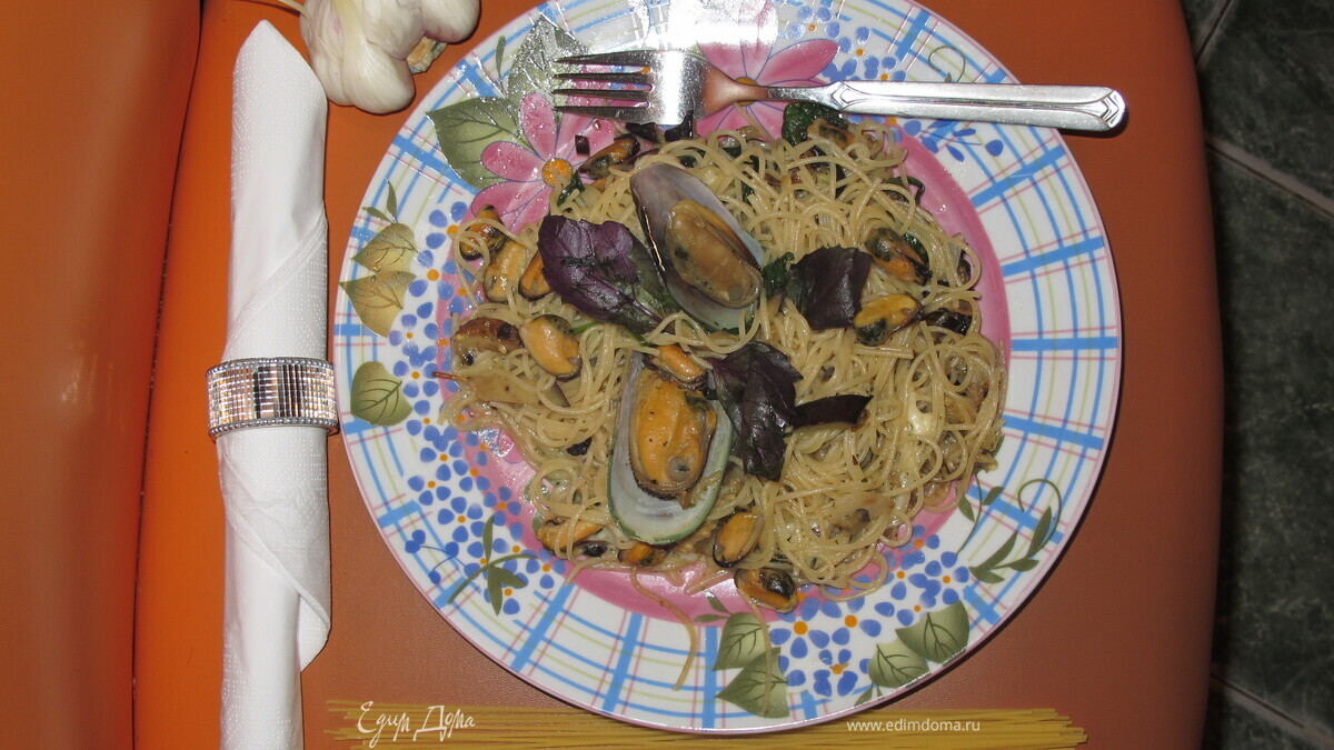 Паста с мидиями, баклажанами и базиликом