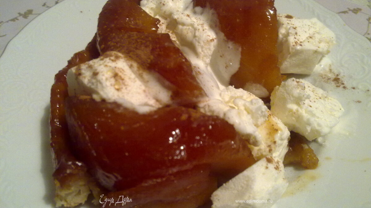 Слитую карамель с яблочным соком снова ставим на средний огонь и даем загустеть. Форму с пирогом накрываем тарелкой и резко, чтобы не развалился, переворачиваем Татэн. И "глазируем" горячей карамелью. - Шаг 7