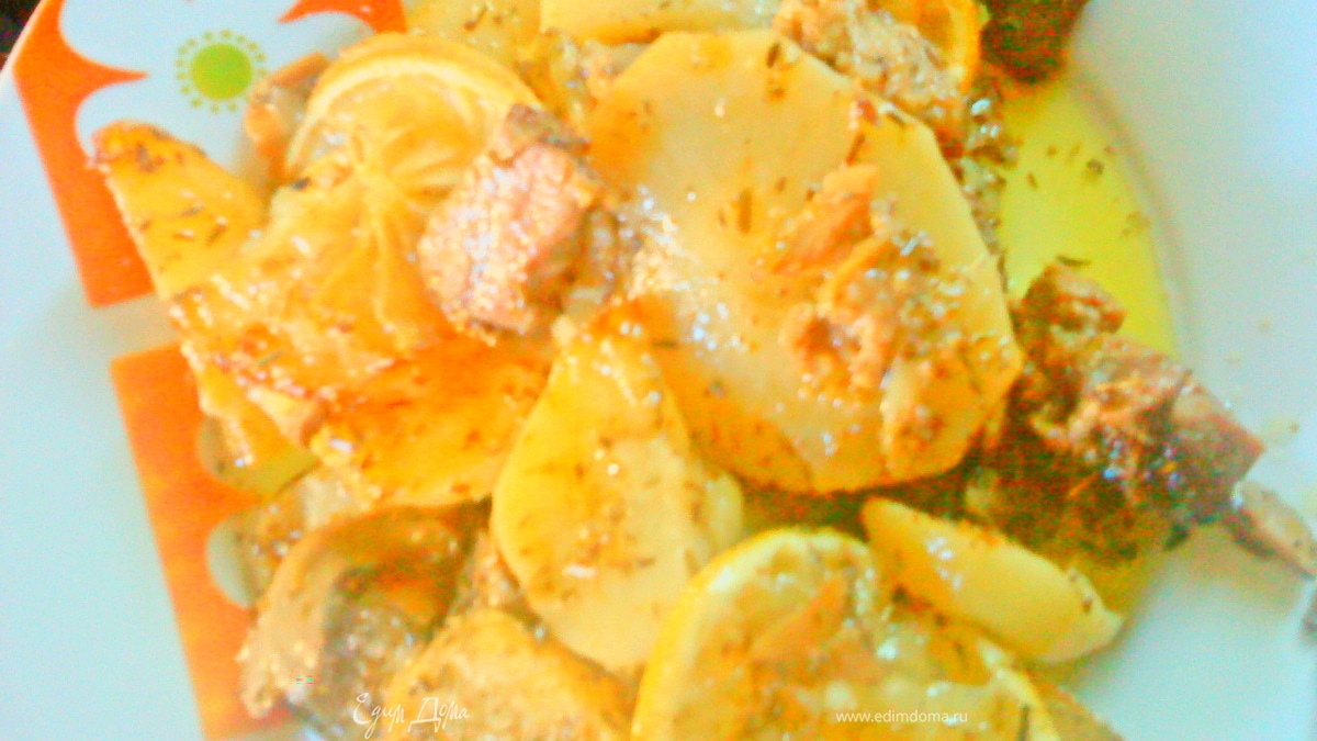 - Шаг 4Выкладываем на картошку сверху нарезанный кружками лимон. Печем еще 20 минут.