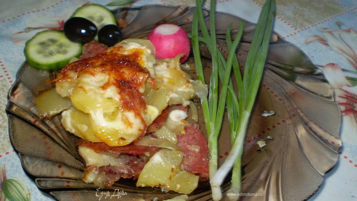 - Шаг 1шар - на низ формы порезать кольцами салями шар - полукольцами лук шар - салями кольцами шар - картофеля порезаного как на жарку шар - картофель посолить, смазать майонезом и посыпать потертым сыром и в духовку запекать