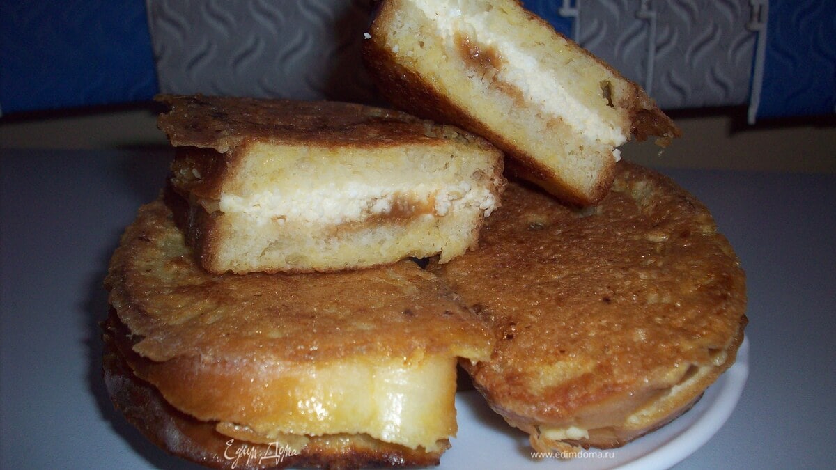 - Шаг 1Нарезать черствый батон на тонкие пластинки, каждый ломтик в центре смазать вареной сгущенкой, намазать тонкий слой сладкого творога, накрыть вторым ломтиком.