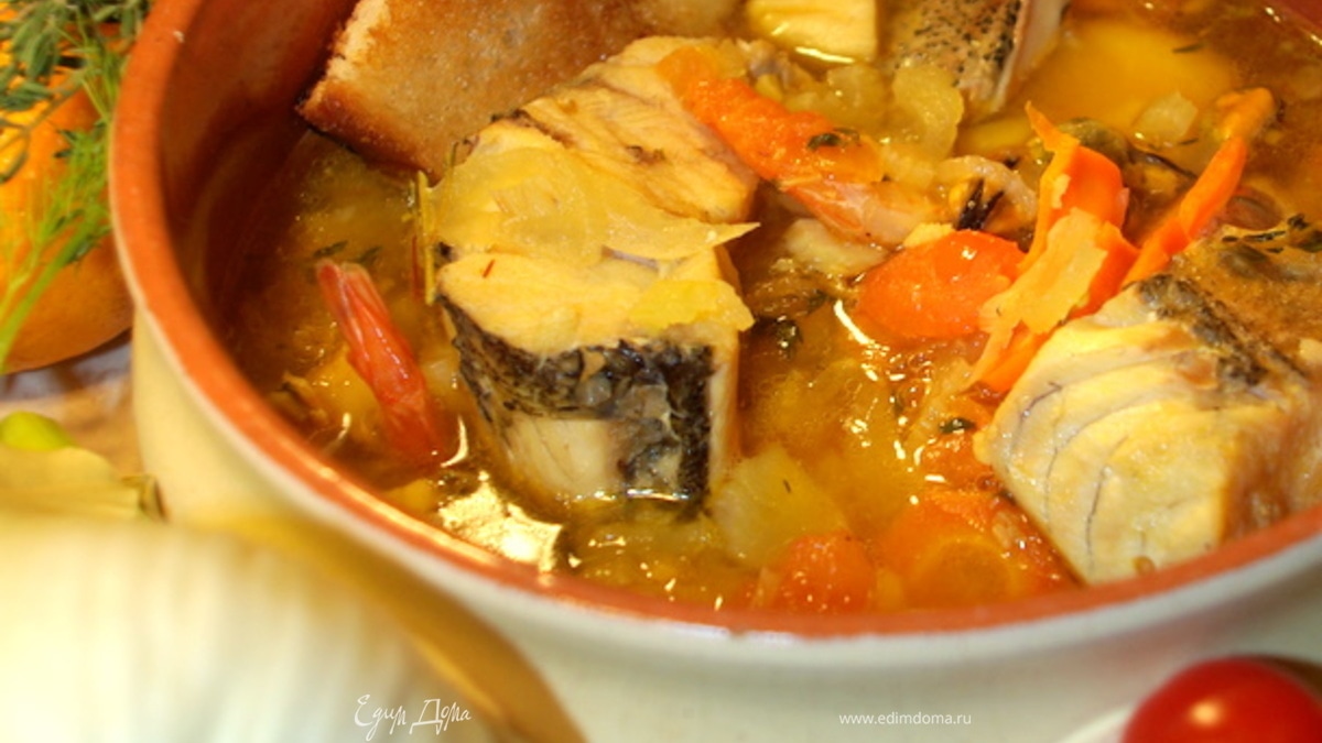 - ПодготовкаСварить бульон из щучьей головы, хвоста и плавников. Посолить его и добавить лимонный сок. Процедить бульон, отделить мясо от рыбных костей. Очистить лук и морковь, порезать их колечками. Чеснок раздавить, сельдерей порубить. В большой кастрюле разогреть растительное масло, обжарить овощи. Добавить рубленную зелень фенхеля, майоран, лавровый лист, апельсиновую корку и картофель, порезанный ломтиками. Залить овощи бульонов из рыбных остатков. Положить в бульон судака и варить 10 - 15 минут. Добавить очищенные от кожицы и семян и порезанные помидоры, шафран и перец. Через 10 минут добавить мидии и креветки, довести суп до кипения и снять с огня. Белый хлеб обжарить в растительном масле, натереть чесноком. Подавать с супом.