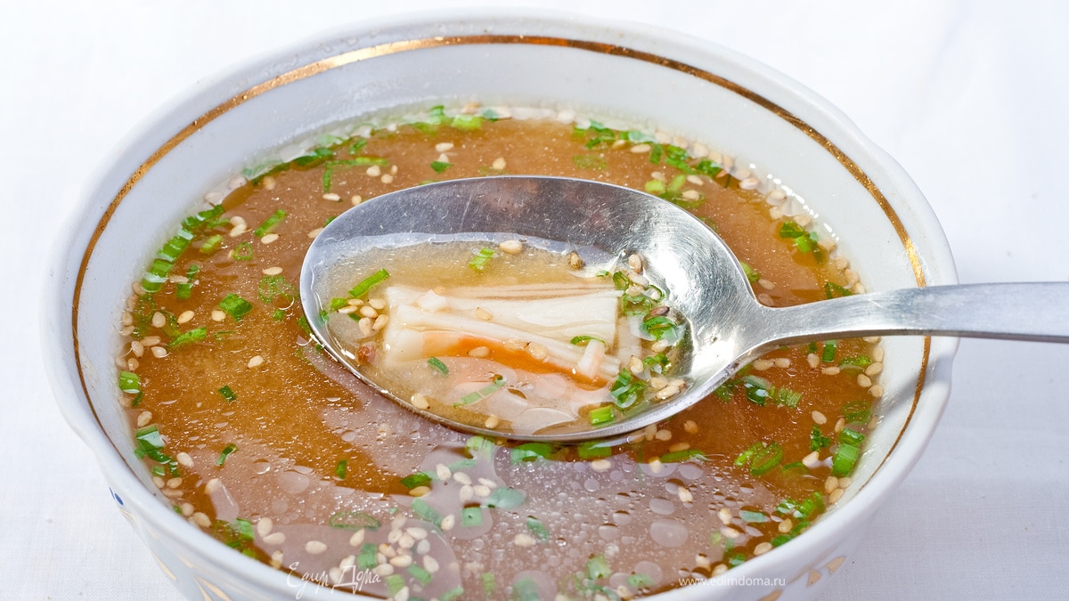 - Шаг 11.Доводим рыбной бульон до закипания и добавляем немного соевой пасты 2.Процеживаем рыбный бульон 3.Мелко нарезаем палочки с мясом краба, зелёный лук и водоросли вакаме добавляем в суп
