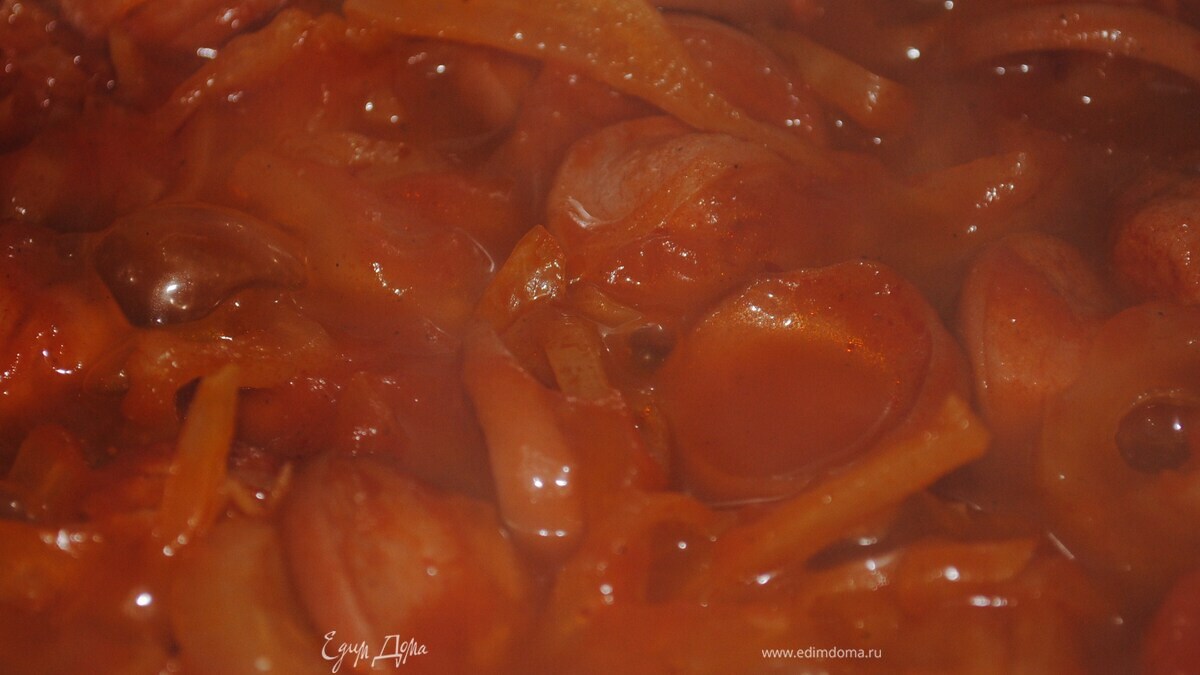 Берем сосиски и нарезаем колечками,кидаем их в разогретую кастрюлю с растит.маслом,обжариваем.После того,как они обжарились,до той степени,что Вам понравилась,добавляем том.пасту и чуть воды,тушим минуток семь. - Шаг 1
