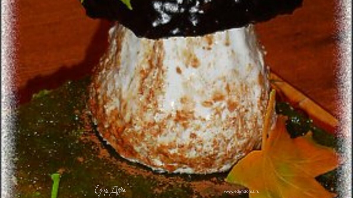 Варим глазурь (3 ложки какао, 3 ложки сахара, 3 ложки молока, 70 г масла) и покрываем ей шляпку гриба. Шляпку помещаем на ножку. Декорируем листьями из мастики. - Шаг 9