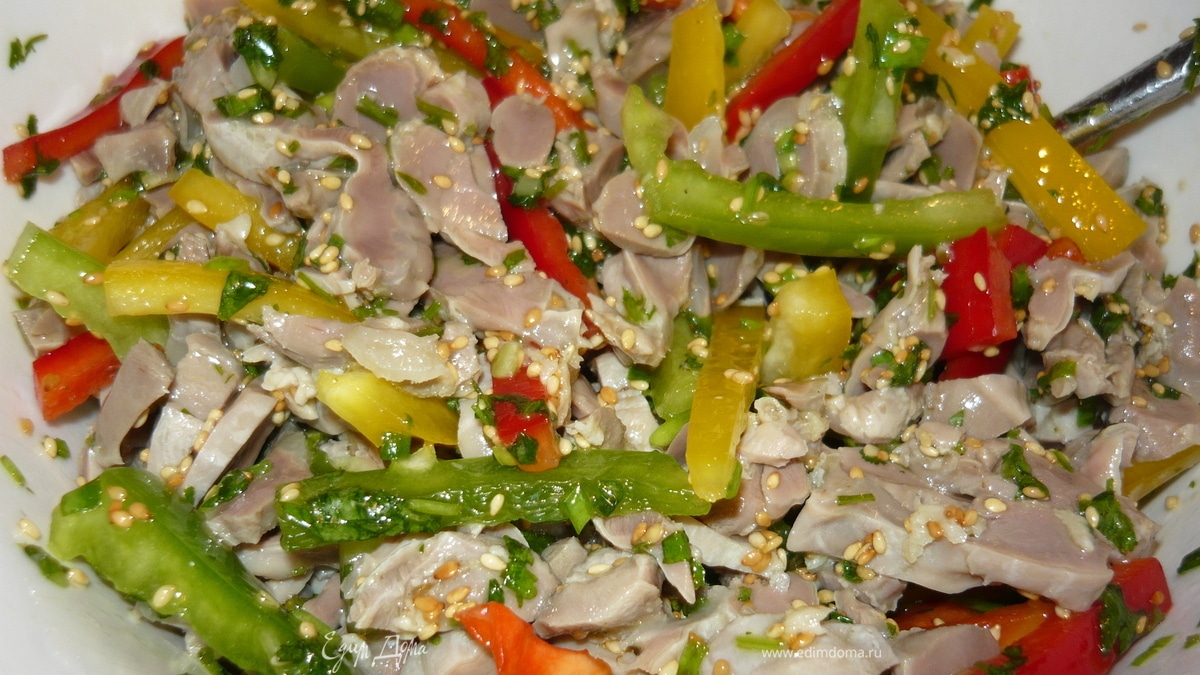 Куриные желудки отварить до готовности. Я обычно после закипания сливаю первую воду, чтобы не горчили. Остудить, нарезать тонкой соломкой. Кинзу и лук мелко нарезать и перетереть с солью. Перец нарезать тонкими полосками. Все ингредиенты смешать, сложить горкой.