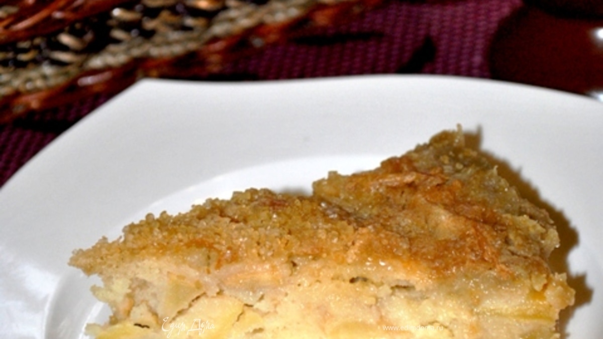 - Шаг 1Духовку нагреть до 160 С. Круглую форму диаметром 22см смазать маслом, дно выложить пергаментом. Помыть и почистить яблоки, убрать сердцевину, порезать дольками и выложить на дно формы. Все ингредиенты для теста взбить миксером и вылить на яблоки, разровнять. Поставить в духовку и выпекать 40-45 минут до золотистой корочки. Взбить все ингредиенты для крема. Вынуть пирог из духовки, выложить на него крем, разровнять и поставить опять в духовку ещё на 20-25 минут. Готовый пирог Посыпать коричневым сахаром, остудить полностью в форме, затем вынуть из формы. Смачного!