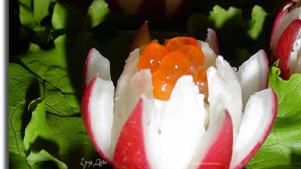 Моем редис, обрезаем верх и низ, ножом прорезаем "лепестки", а затем подрезаем и удаляем мякоть из под "лепестков". Также прорезаем следующий ряд "лепестков" в шахматном порядке. Ложкой-нуазеткой(а можно чайной, или кофейной ложкой) удаляем серединку будущего цветка, и получаем "кувшинку" из редиса. - Шаг 2