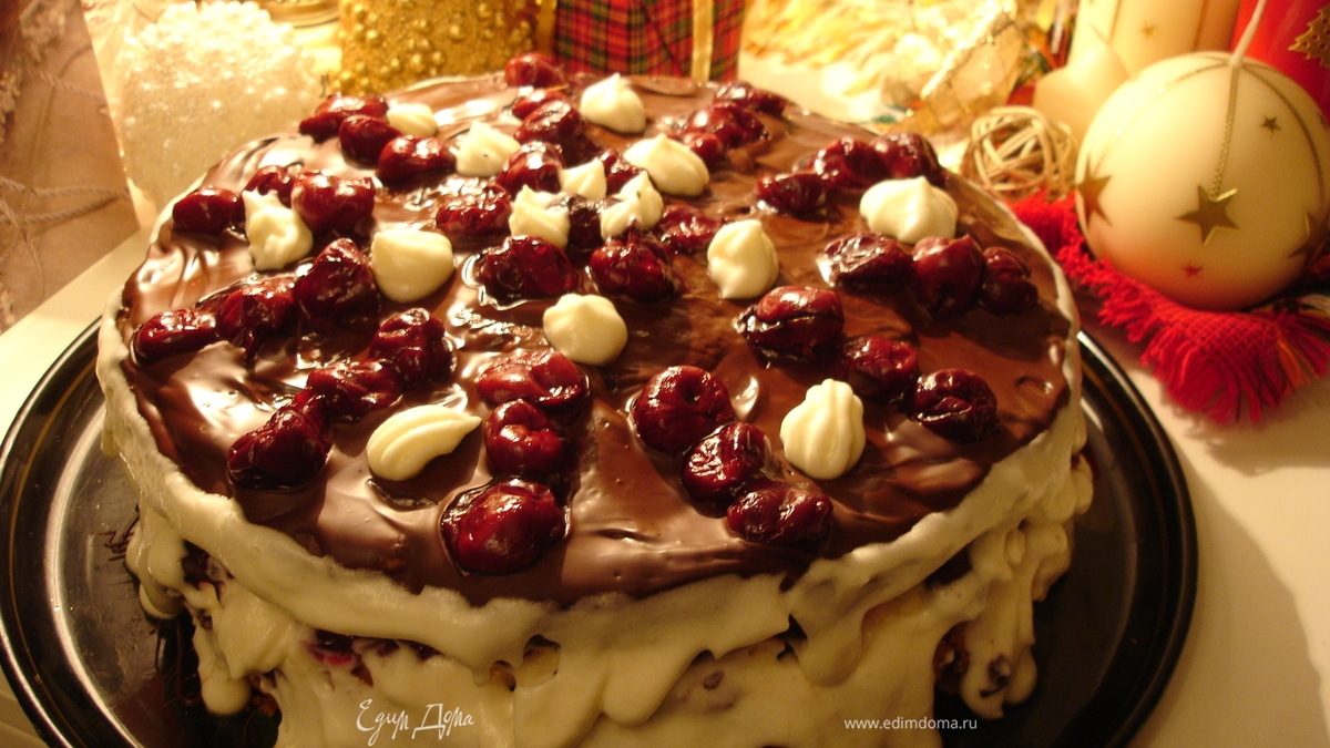Нежный торт, состоящий из бисквитных коржей с яблоками, ароматной корицей и грецкими орехами, вишневой прослойки, зефира, сливок и шоколада. Рецепт этого торта взят из журнала "Школа гастронома" за 2004 г. Я внесла некоторые изменения и вот мой вариант рецепта. Сделала его на Новый год, гости были в восторге! Надеюсь, и вам понравится! :)