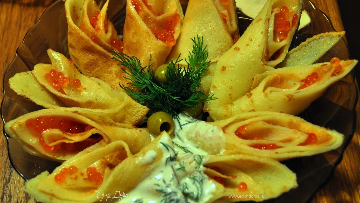 - Шаг 1В посудине взбиваем яйца, смешиваем с сахаром и солью, затем вливаем молоко - размешиваем, всыпаем понемногу муку и ложку подсолнечного масла - доводим до однородной массы. Выпекаем на сухой сковороде. Еще теплый блин с одной стороны смазываем сливочным маслом и выкладываем ровным, не густым слоем икорку. Скручиваем в трубочку и разрезаем по диагонали. Выкладываем веером и поливаем соусом. Приятного аппетита!