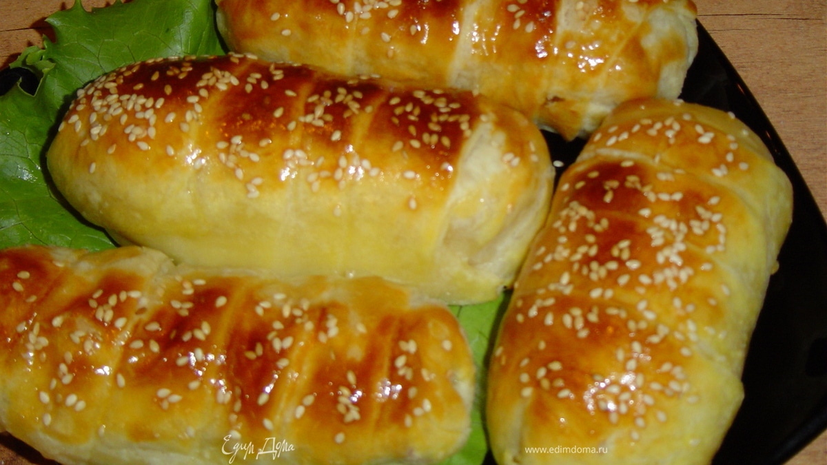 Уложите трубочки на влажный противень. Смажьте сверху желтком и посыпьте кунжутом. Выпекайте при температуре 260 гр. 15 -20 мин. до образования румяной корочки.