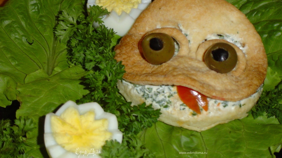 Из кусочка помидора делаем язычок. Вот квакушка и готова!Приятного аппетита!!!!!!!!!!!! - Шаг 7