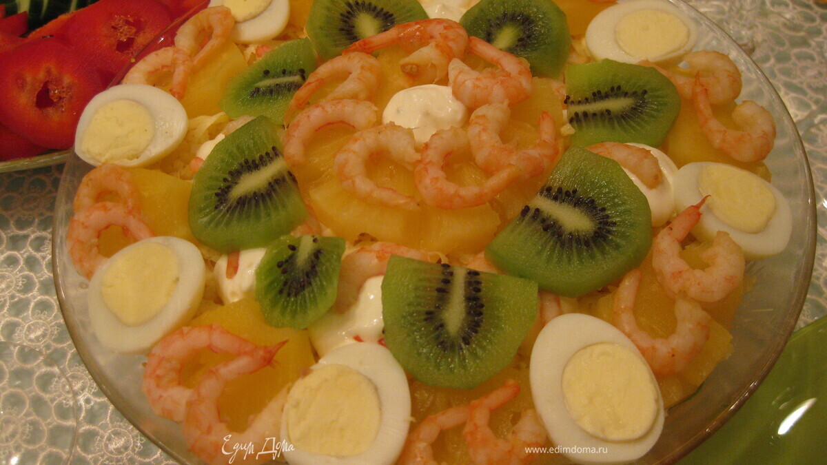 - Шаг 2Всё уложить в слои, каждый слой промазать майонезом: - кубики ананасов - рубленые яйца - нарезанные креветки - тёртый сыр.