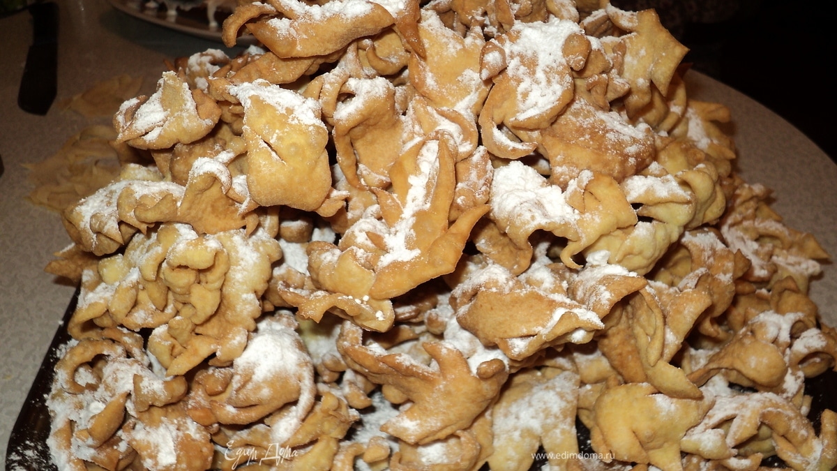 смешать все ингредиенты,добавить муку,круто замесить тесто,тонко раскатать,нарезать лентами(не длинее 10см)по длинне сделать надрезы "елочкой",в высокую, не широкую, кастрюлю налить растительное масло (400гр.) и разогреть,скидыватьпо 3-4 шт.,обжаривать до золотистого цвета,вытаскивая дать немного стечь маслу,посыпать сахарной пудрой.Всем приятного аппетита