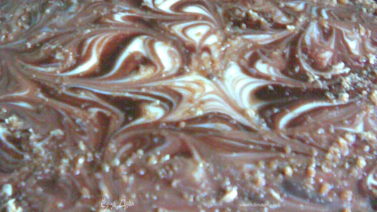 Готовый бисквит разрезать смазать кремом.Верхнюю часть покрывать кремом способом поочерёдного наливания по центру крема и глазури(ложка крема,ложка глазури).После зубочисткой сделать разводы.Посыпать измельчёнными орехами.