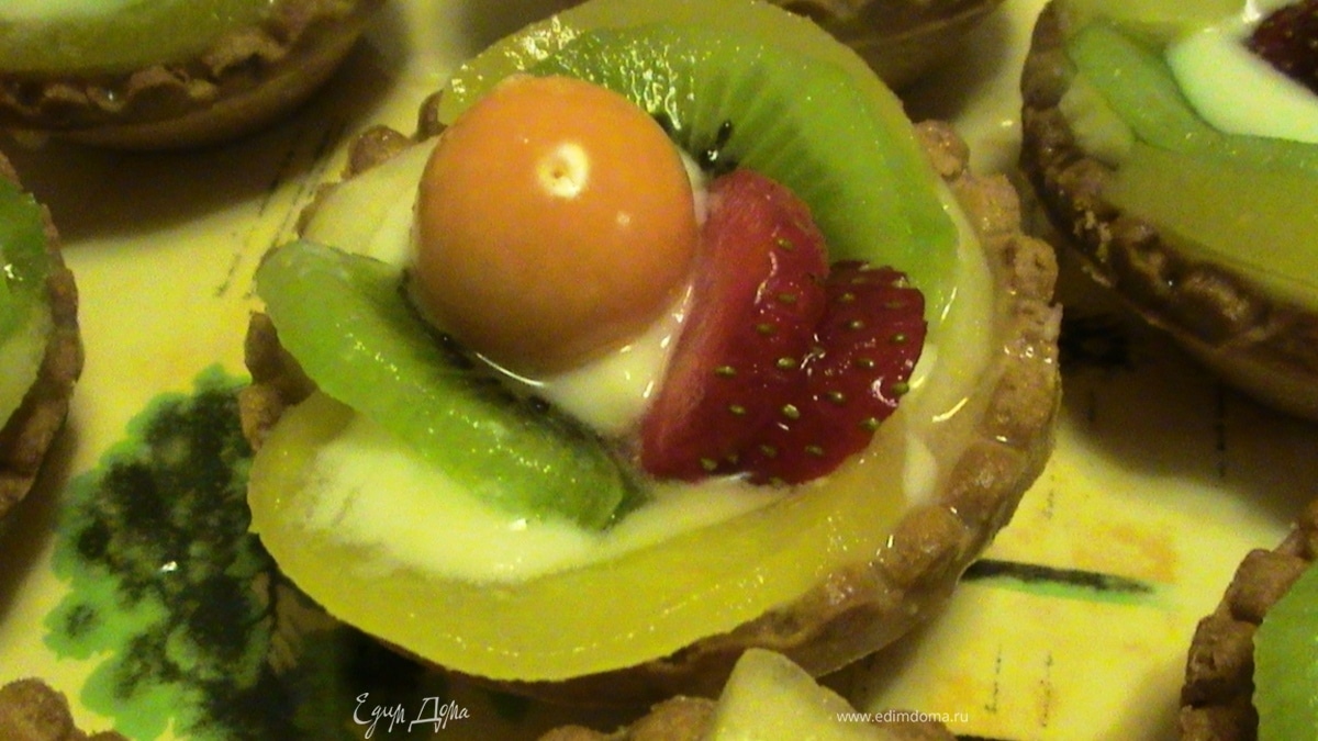 В песочные корзинки выложить заварной крем, затем фрукты и ягоды. Для того, чтобы фрукты не потемнели на них необходимо нанести разведенный пищевой желатин. Корзинки готовы. Приятного аппетита.