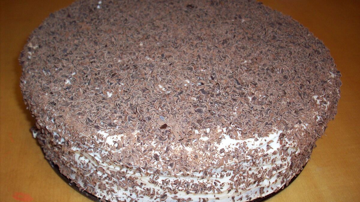 Корж разрезать на несколько частей. Собрать торт, смазывая коржи кремом и посыпая шоколадом. Поставить в холодильник минимум на 3 часа.