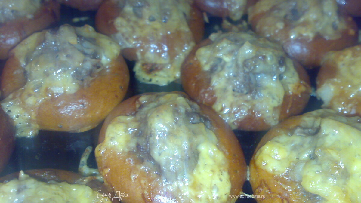- Шаг 1Сушки вымачиваем 2 минуты в молоке, и выкладываем на смазанный маслом противень. В каждую дырочку выкладываем массу из фарша и сверху посыпаем тертым сыром.