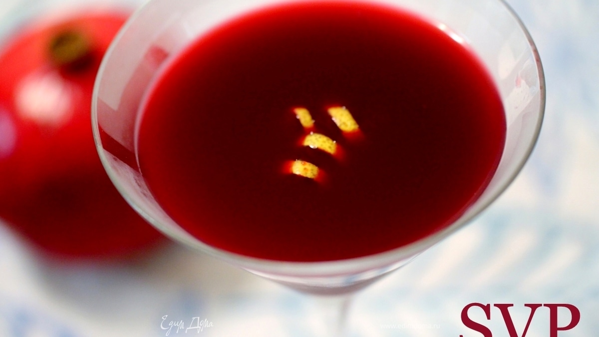 Берем семена половинки граната и хорошо их промываем под холодной водой. Выкладываем их в небольшое сито и давим над стаканом обратной стороной столовой ложки. Размешиваем сок с сахаром. По скольку сок получается терпким, сахар можно добавить по собственному вкусу. Добавляем в шейкер водку, гранатовый сок, несколько кубиков льда и перемешать. Перелить в охлажденный бокал для мартини и украсить апельсиновой завивкой.