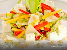 Выложить подготовленную зелень в салатницу, полить заправкой, сверху разложить кусочки запеченного с сыром багета.