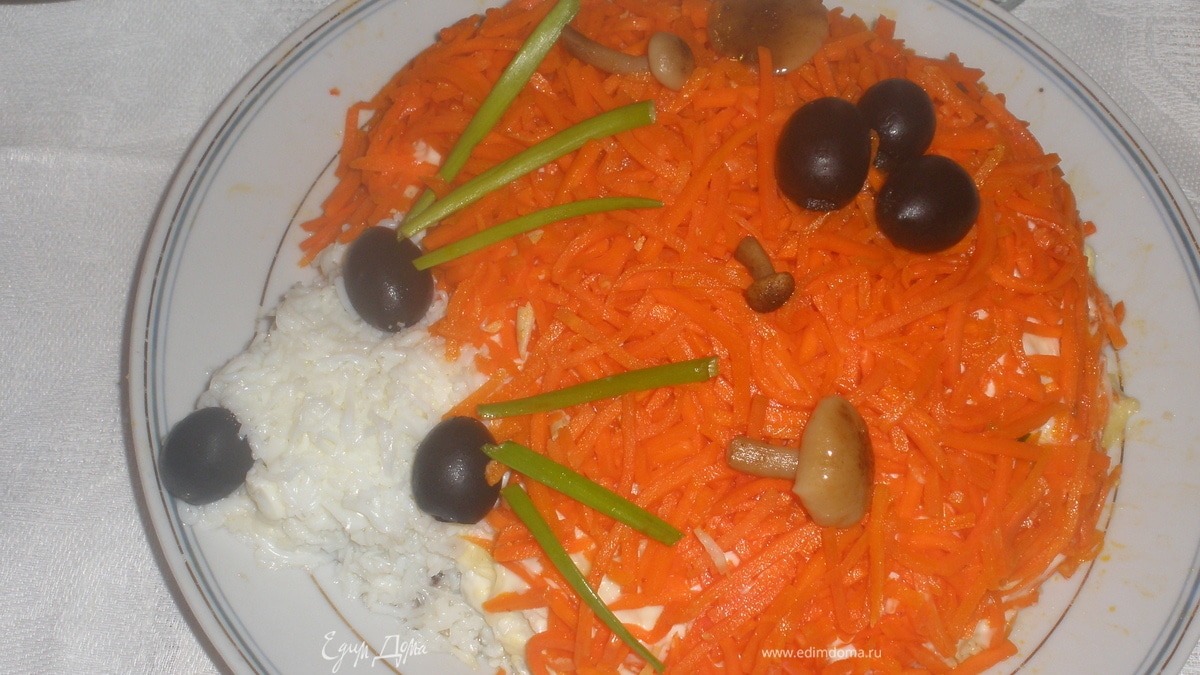 - Шаг 1Собираем ёжика,1слой-грибы,(делаем форму овальную,как туловище ёжика)1слой- куриное филе,смазываем майонезом.3 слой -желток,тоже смазываем майонезом,Мордочку выкладываем белком натёртым на мелкой тёрке.4 слой-сыр,смазываем майонезом.Последний 5 слой- корейская морковь(если слишком длинная порезать)(Делала с варёной морковью,но с корейской интереснее)Мордочку оставляем белой.